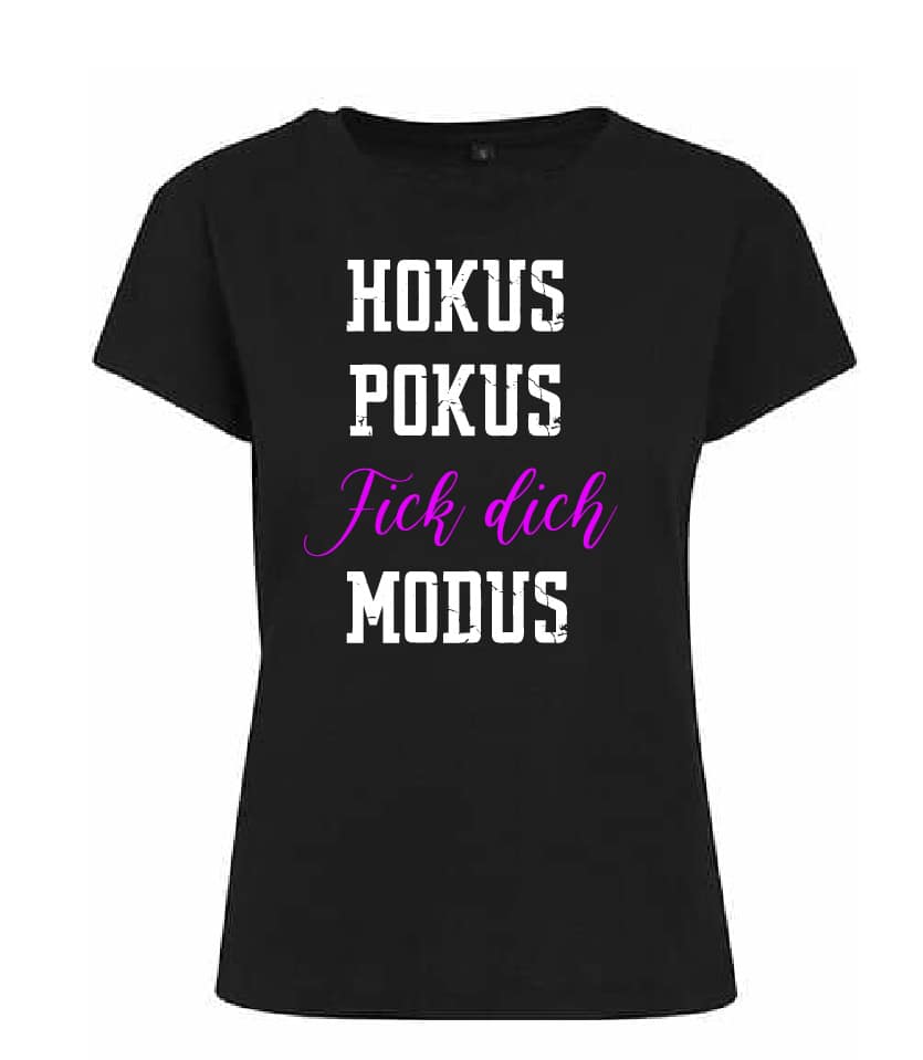 Dieses T-Shirt ist kein Mode-Statement – es ist eine Ansage. Der auffällige Spruch „Hokus Pokus Fick dich Modus“ bringt auf den Punkt, was viele denken, aber nicht jeder ausspricht. Ideal für Frauen, die Haltung zeigen, Humor haben und keine Lust auf leere Höflichkeitsfloskeln.