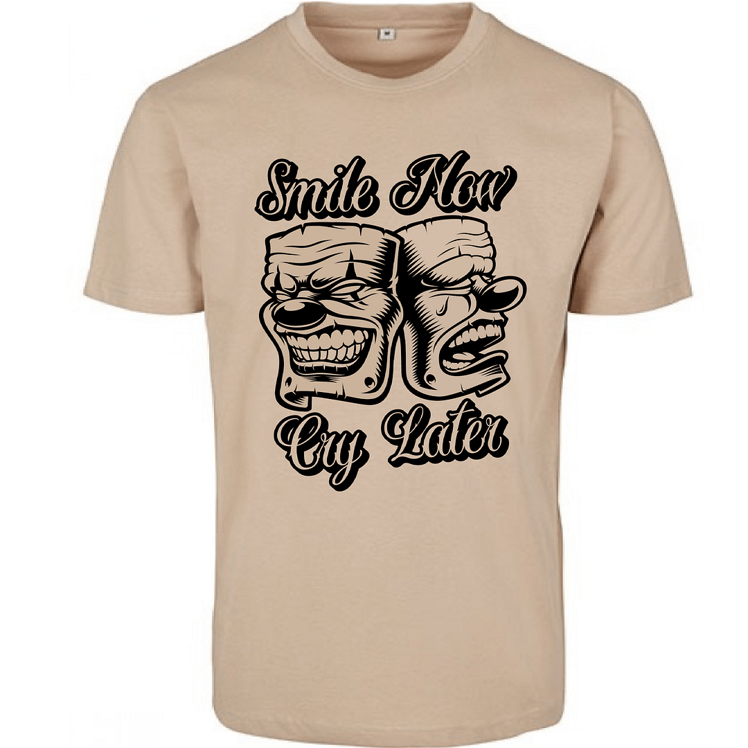 Das T-Shirt besticht durch das ikonische „Smile Now, Cry Later“-Design, inspiriert von den klassischen Theatermasken, die Freude und Trauer symbolisieren. Das Motiv ist in einem ausdrucksstarken, detaillierten Stil gehalten und hebt sich mit kräftigen schwarzen Linien und einer einzigartigen Ästhetik vom Shirt ab. Dieses Shirt vereint Komfort und Stil in einem einzigartigen Design das Blicke auf sich zieht.